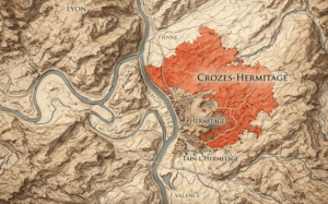 Crozes-Hermitage is Syrah’s cozy backyard, tucked along the Rhône River’s east bank in France’s Northern Rhône Valley, rubbing elbows with the iconic Hermitage hill like the popular kid’s reliable sidekick. It blankets 2,073 hectares across 11 communes—Crozes, Mercurol (where Combat calls home), Gervans, Larnage, etc.—plopped right on the 45th parallel, where vines usually decide to get serious. Hills undulate like a rollercoaster, terraces stack up like Jenga, and plateaus yawn wide, all crashed by cherry trees, apricot groves, green fields, forests and protected areas with rare plant species. Then comes the Mistral, that relentless wind beast, blow-drying the grapes, shooing away clouds, and slapping down disease.